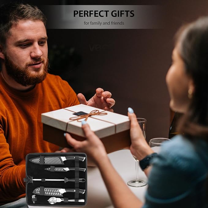 - Essential Kitchen Knife Set – It includes a versatile 8-inch chef’s knife for chopping, slicing, and dicing; a 7-inch Japanese Santoku knife for delicate slicing and mincing; a multi-functional 5-inch utility knife for everyday tasks; knife sharpener rod, premium steak knife fork & spoon set, 3pcs knife sheaths, dishcloth, 3pcs finger guard, gifts stickers, knife storage bag. Easy knife maintenance.