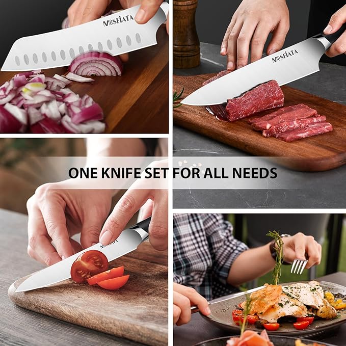 - IDEAL GIFT: MOSFIATA 11-piece stainless steel kitchen knife set with sheath and premium bag. Ideal gift choice for birthdays, weddings, anniversaries, Mother's Day, Father's Day, Christmas, chef, etc. A necessity for daily family kitchen use.