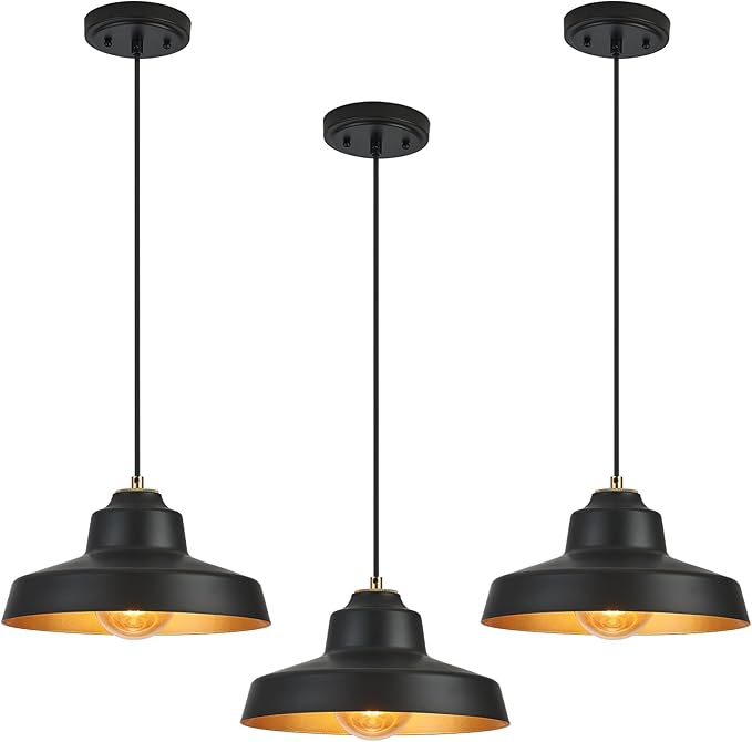 - [Industrial & Vintage Design]: 3-Light industrial farmhouse pendant light fixtures with adjustable cord, mattle black finish featuring retro-style dome shade, this antique pendant lighting is made of sturdy metal construction in black finish and inner gold finish.The vintage pendant lights is ideal for home, dining room, kitchen island, warehouse, entryway, corridor, restaurant, cafe, bar, club, barn, working bench.