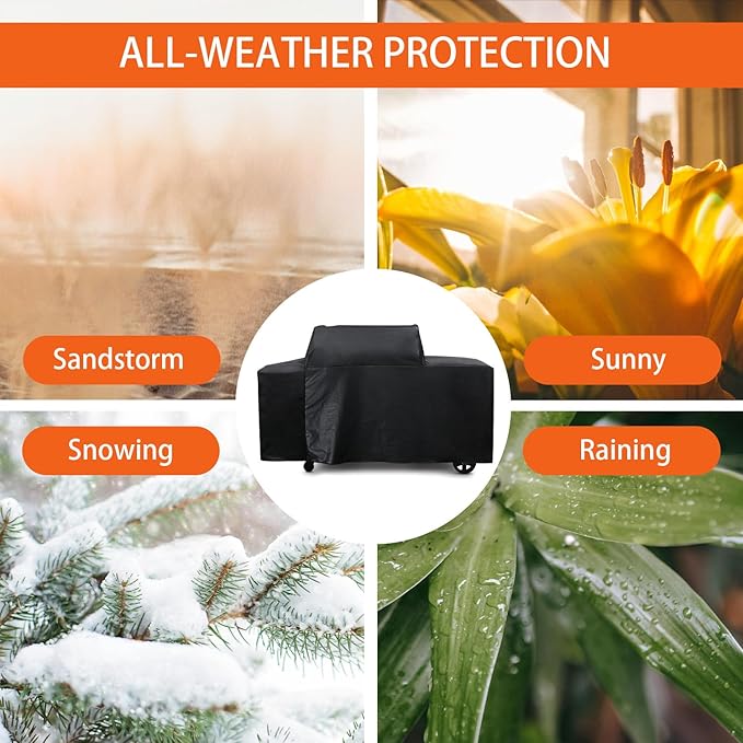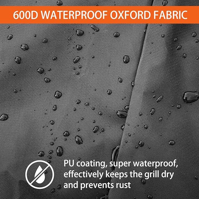 - DURABLE MATERIAL - Made of 600D oxford cloth PVC material. That will resist cracking, fading, and scratches; It's also water-resistant, grill cover has a good barrier effect and can resists snow, rain, tearing and cold cracking, gives your grill all year round protection against all elements.