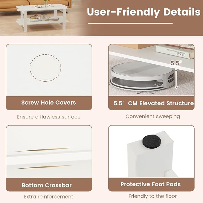 - User-Friendly Details: The 45''L x 23.5''W x 18.5''H coffee table features a 5.5'' bottom clearance, which makes it easy to sweep or vacuum underneath. Additionally, it comes with protective foot pads that protect your floors from scratches.