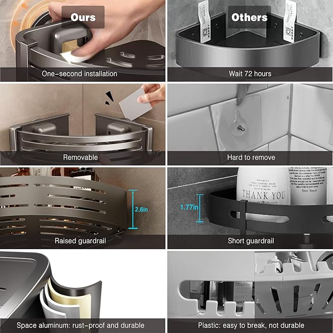 - 【Hollow Design and Rust-proof】 The suction corner shower shelf is made of high-quality space aluminum with anti-oxidation treatment on the surface, which is durable and will not rust. At the same time, it is designed with a hollow structure to enhance air circulation and rapid drainage, reduce water accumulation and turbid residue, and facilitate long-term cleaning and maintenance in humid environments.