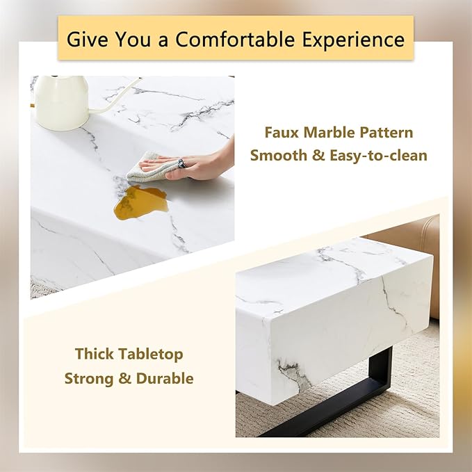 - [Stable Material] The top of this coffee table with storage is made of veneer with imitation marble patterns. Sturdy while maintaining a beautiful appearance. And the legs of this coffee table are made of stable metal legs that are not easily shaken or tilted, making them suitable for long-term use.