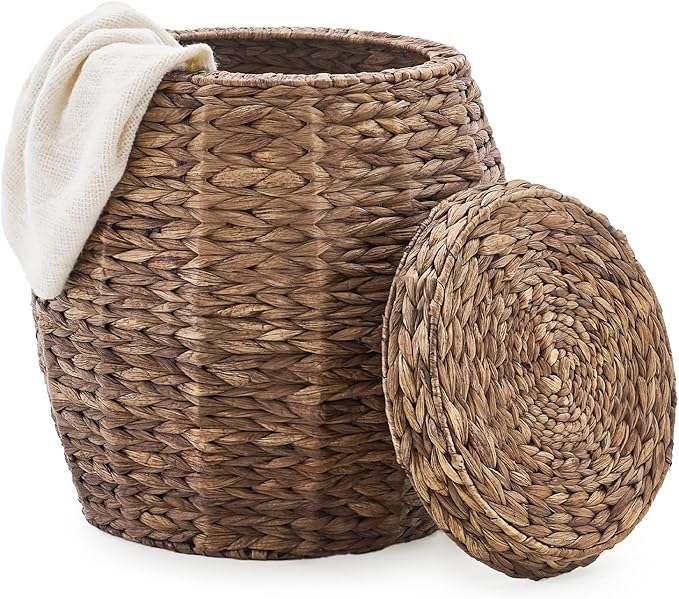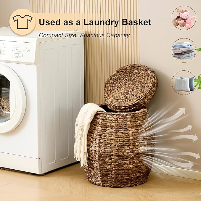 Round Wicker Basket with Lid, Handwoven Hyacinth Storage Basket, Blanket Organizer Basket for Laundry, Bathroom, Bedroom, Living Room, Office