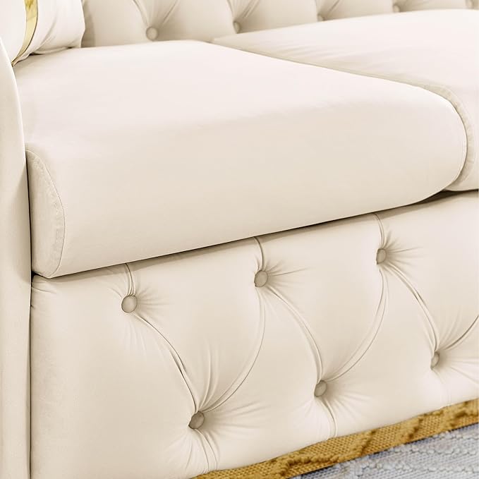 KEIKI 91" Luxury Oversized Velvet Chesterfield Sofa with Gold Stainless Steel Accents and 2 Pillows, Mid-Century Style 3-Seater Button Tufted Couch, Easy Assembly, for Apartment, Living Room, Beige