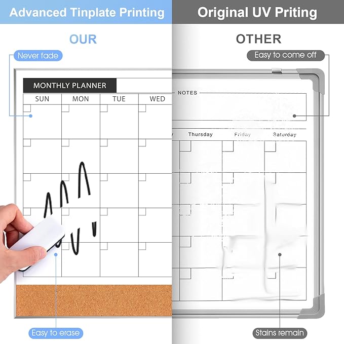 - Clear Lines & Smooth Writing & Easy to Clean: Our calendar board adopts advanced tinplate printing technology, with an additional layer of varnish protection layer compared to ordinary three-layer calendar boards on the market, so the lines will never fade and the board surface has undergone 100000 writing & erase tests with a longer lifespan.