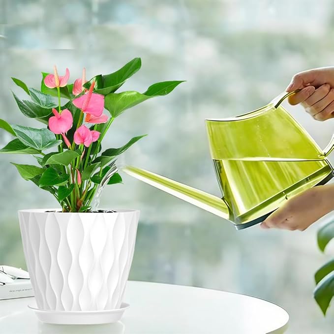 7 Inch Plant Pots 5 Pack, Plastic Flower Pots with Drainage Holes Saucers, Indoor Outdoor Planters for Plants, Lightweight Durable,White