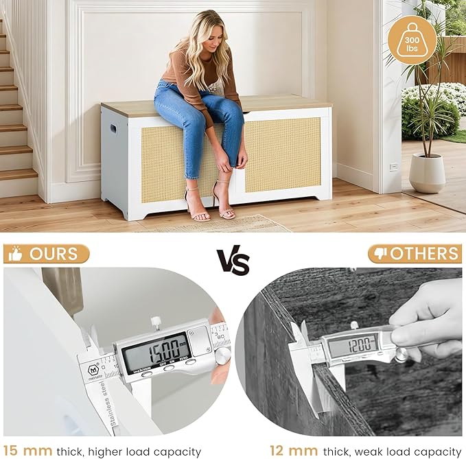 - Thick Particleboard: This bench uses 15mm (0.59 inch) thick panels for the body and sides (stronger than standard 12mm/0.47 inch boards!), with a 9mm (0.35 inch) thick bottom panel. Supports 300 lbs