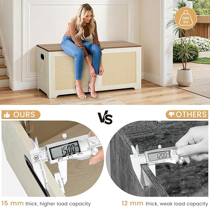 - Thick Particleboard: This bench uses 15mm (0.59 inch) thick panels for the body and sides (stronger than standard 12mm/0.47 inch boards!), with a 9mm (0.35 inch) thick bottom panel. Supports 300 lbs