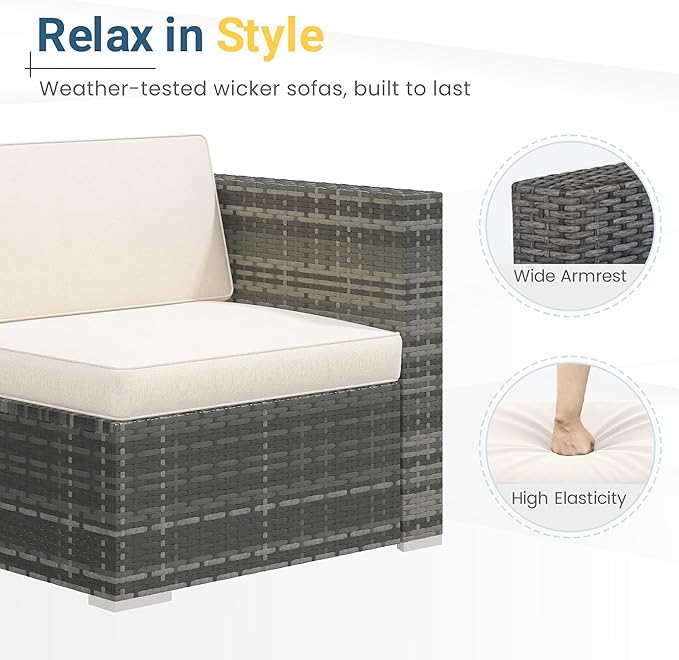 - Build To Last: The 5-piece patio furniture set includes 2 corner sofas, 1 armless sofa, 1 ottoman, and 1 coffee table with a tempered glass top. It features an iron frame for added stability, while the handwoven rattan surface is smooth and waterproof, ensuring durability for long-lasting outdoor use.