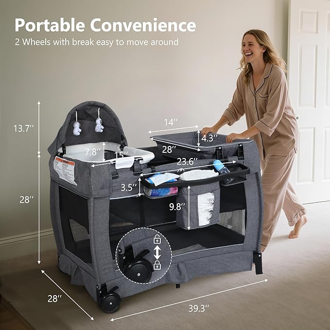 - Multifunctional Design: This pack n play has 4 in 1 mode – baby crib, changing table, playpen, and baby bassinet; The removable changing table and bassinet make switching mode easily; The bassinet features a canopy and 2 hanging toys for baby's delight