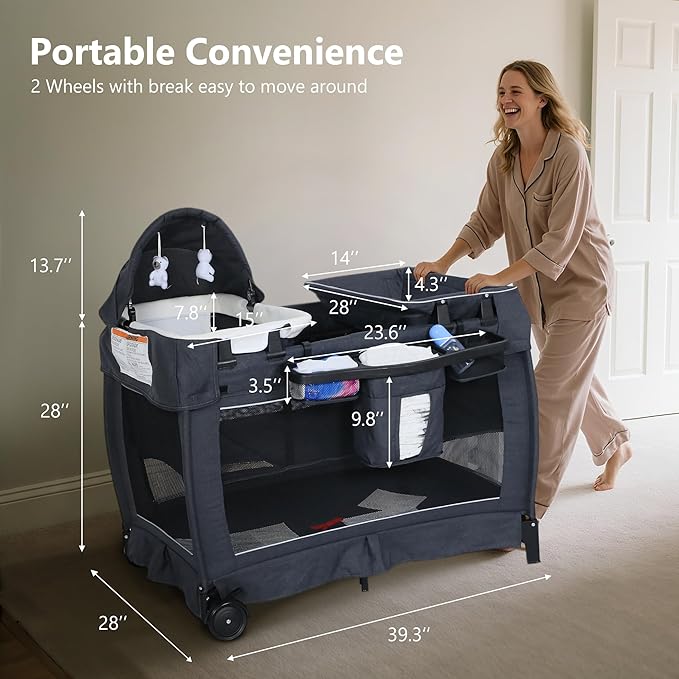- Multifunctional Design: This pack n play has 4 in 1 mode – baby crib, changing table, playpen, and baby bassinet; The removable changing table and bassinet make switching mode easily; The bassinet features a canopy and 2 hanging toys for baby's delight