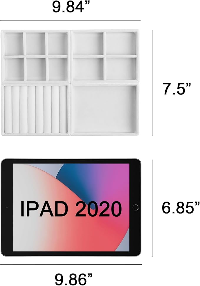 - Stackable and Adjustable:You can stack 2 or more trays to save your space.Dividers in the trays can be removed to fit your larger organizer needs.Experience the ultimate convenience and elegance with this velvet jewelry organizer, designed to fit seamlessly into any drawer or vanity setup