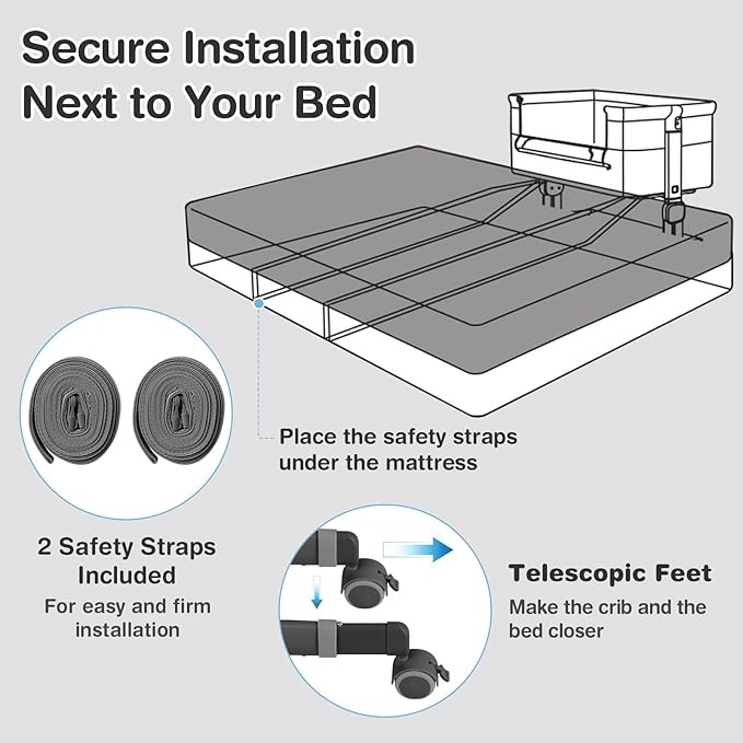 - Scientific & Intimate Details: The bedside bassinet features retractable silent wheels make the bedside mode fit more closely into the parent’s bed. Additionally, newborn sleeper has a storage basket for better organization of the baby’s daily necessities. This crib does not require tools to install