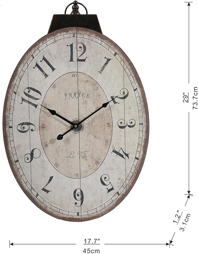 18" x 29" Rustic Farmhouse Oval Wall Clock, Solid Wood Silent Non-Ticking, Battery Operated Decorative Clock for Living Room, Kitchen, Bedroom, Office and Home Decor