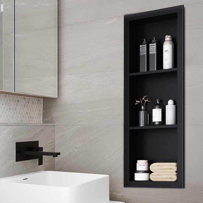 - 【Minimalist Appearance】This bathroom niche features a modern, minimalist design with a sleek matte black finish that blends seamlessly into any contemporary space. Its understated elegance enhances your interior, while the sturdy construction transforms everyday storage into a touch of minimalist luxury