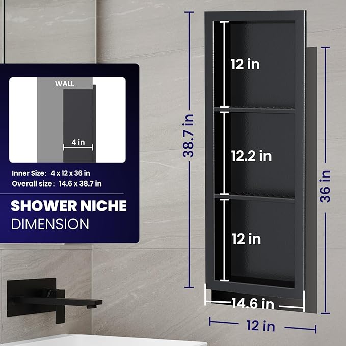 - 【Three-Tier Storage】With a thoughtful 3-tier layout and generous internal dimensions (36" H x 12" W x 4" D), this bathroom wall niche provides ample space for all your daily essentials — from tall shampoo bottles to folded towels and decor