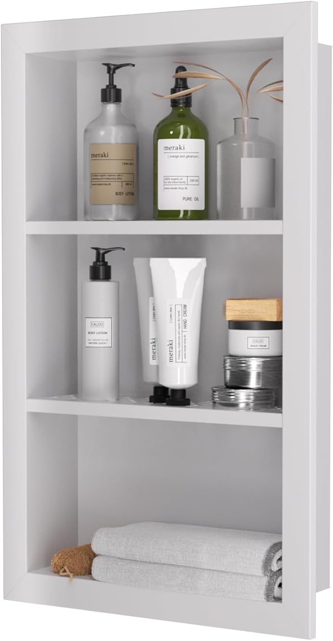 - 【Three-Tier Storage】With a thoughtful 3-tier layout and generous internal dimensions (24" H x 14" W x 4" D), this bathroom wall niche provides ample space for all your daily essentials — from tall shampoo bottles to folded towels and decor