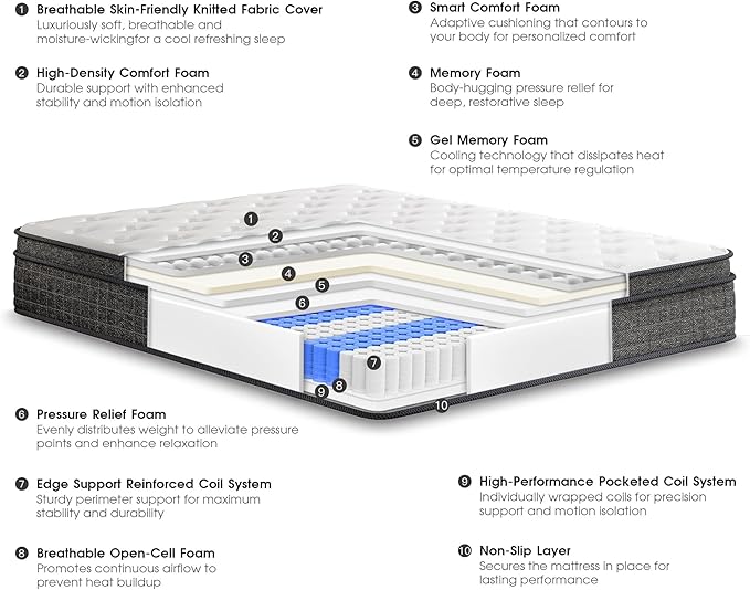 - Temperature Regulation for Better Sleep: Enjoy Breath, undisturbed sleep with TEENO mattress king size, engineered with materials that regulate temperature effectively. These innovative components absorb and dissipate excess heat, maintaining a comfortable sleep surface throughout the night. Unlike traditional mattresses that trap heat, this memory foam mattress king allows for continuous airflow, ensuring a balanced temperature for deep, uninterrupted sleep in any climate