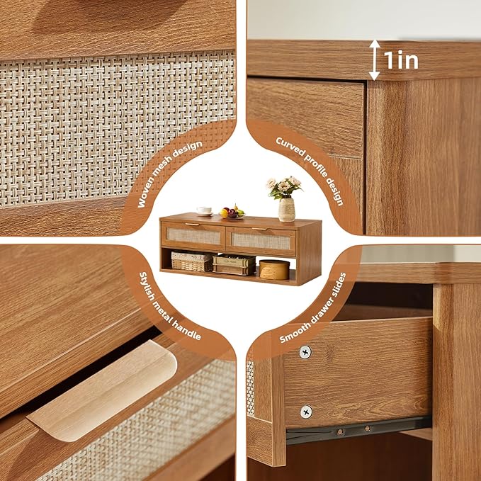 - Bohemian Rattan Coffee Table:Designed to complement the LEYAOYAO furniture collection, this bohemian-style center table for living rooms features an aged wood-grain finish and woven rattan panels. High-quality metal knobs and drawer runners contribute a modern or farmhouse aesthetic.