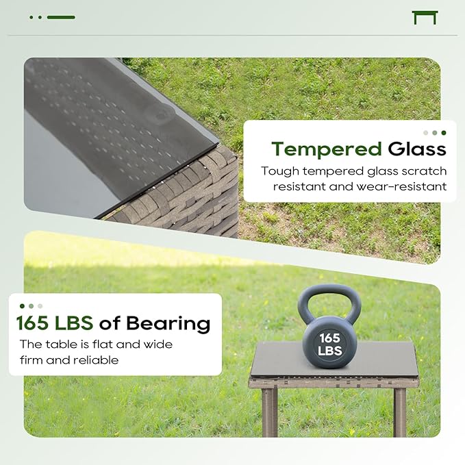 - MODERN STYLE: The patio set includes a table made of high-quality tempered glass for drinks, food, or décor. This sleek rattan design brings modern elegance and style to your outdoor furniture space.