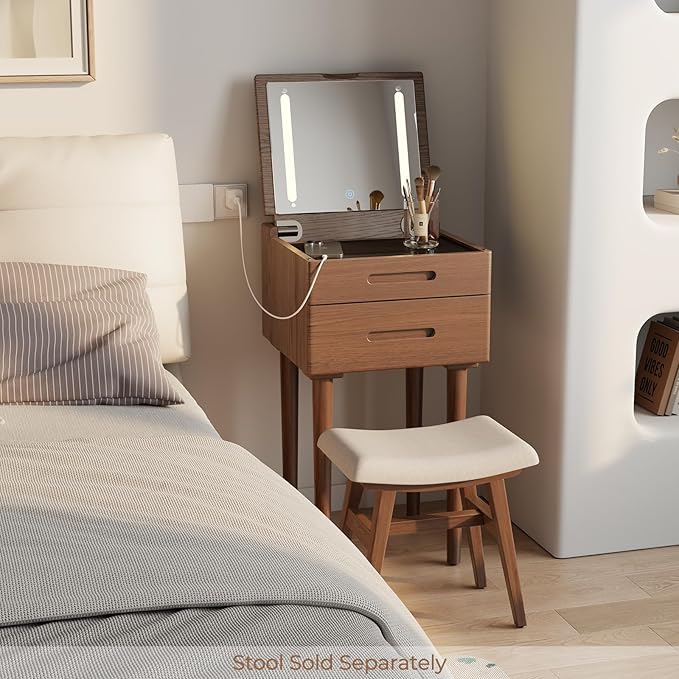 - 【Space-Saving 3-in-1 Vanity】Just 15.7" wide, this makeup desk works as a vanity, desk, or nightstand. Close mirror for a flat surface. Adjustable feet ensure stability, and anti-tip kit adds safety