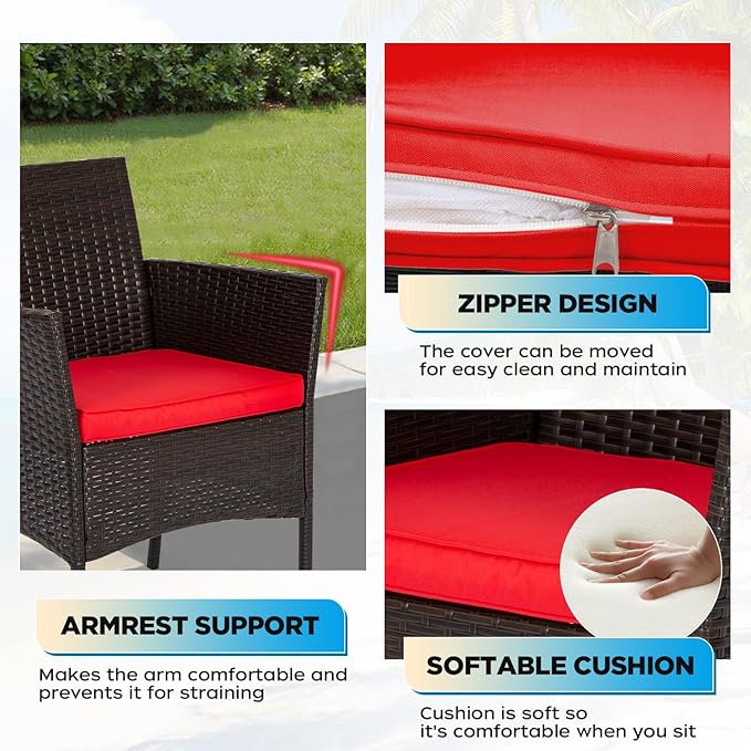 FDW | 3-Piece Patio Furniture Set | Brown & Red | Outdoor Wicker Furniture with Coffee Table | Modern Rattan Chairs Conversation Set | Outdoor Seating | Weather-Resistant | for Porch, Garden, Lawn