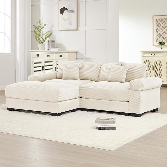 KEIKI 83" L-Shaped Oversized Corduroy Modular Sectional Loveseat Sofa with 1 Ottoman, High-Density Foam Cushion, Extra-Thick Armrest, 2-Seater Fluffy Corner Couch with 6 Pillow, for Living Room, Beige