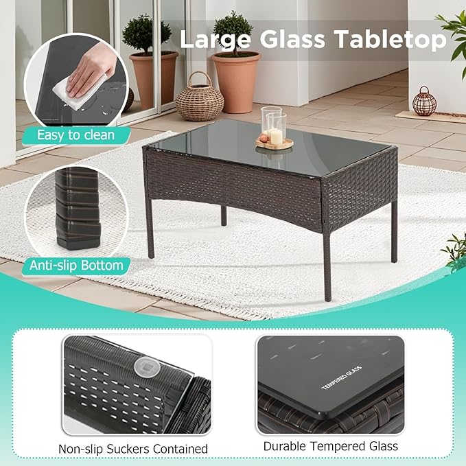- Comfort Seating: This 4-piece rattan furniture set includes 2 chairs, 1 loveseat, and a glass-topped coffee table, complete with thick, soft cushions for extra comfort. The breathable design promote airflow, provide cool and pleasant seating experience even on warm days.