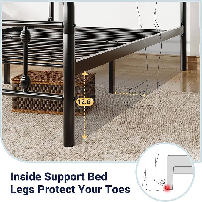 - Elevated and Secure: This classic metal bed features a tall headboard and footboard with smooth, curved corners for comfortable lounging and added safety. The sturdy frame keeps your mattress firmly in place, while strategically placed inner legs and non-scratch footpads protect floorsโand toes