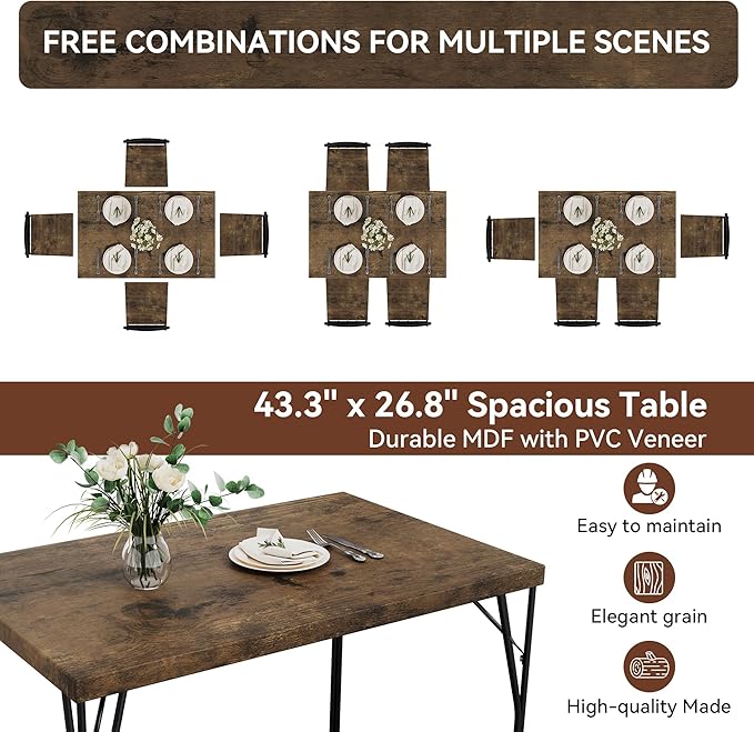 - 【Perfect for Families】: This 4-person set includes a rectangular table (43.3"L × 27.6"W × 29.9"H) and four matching chairs (15.7"L × 17.5"W × 34.6"H). Perfect for family meals and small gatherings, it effortlessly converts to a workspace or game table as needed.
