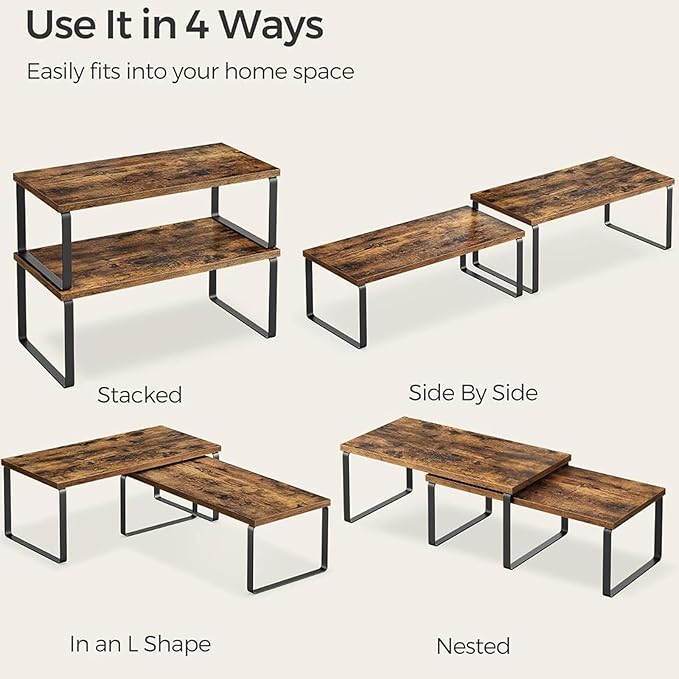 Cabinet Organizer Shelf, Kitchen Counter Storage, 2-Piece Set, Stackable Spice Rack, Metal and Wood (Black and Rustic Brown)