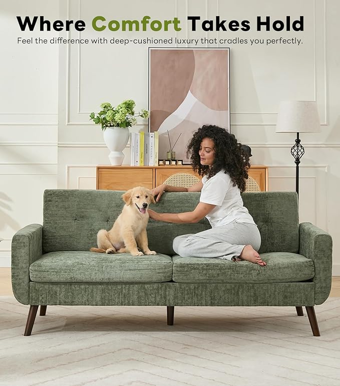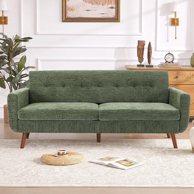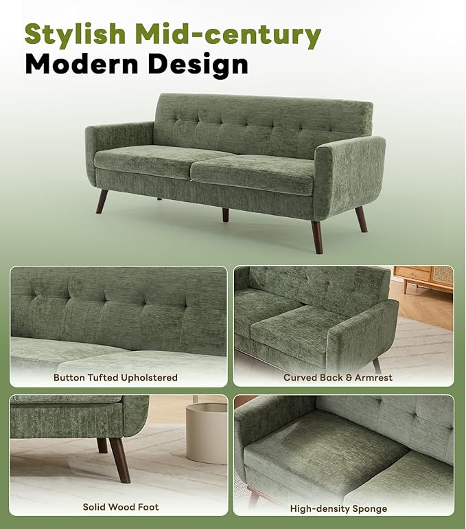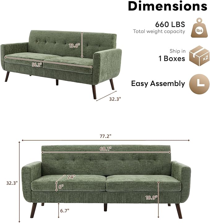 Tbfit 77.2" W Linen Sofa Couch, Mid Century Modern Decor Loveseat Couches for Living Room, Button Tufted Upholstered Small Couch for Bedroom, Solid, and Easy to Install Love Seats Furniture, Green