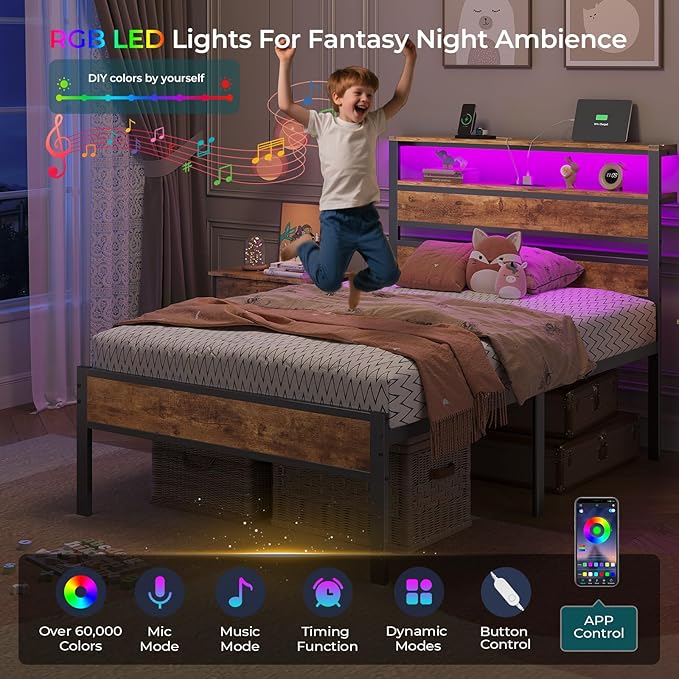 Hasuit Twin Bed Frame with Headboard LED Lights, Twin Size Bed with Charging Station 2-Tier Storage Shelves, Metal Platform Bed with Heavy Duty Slat, Fast Assembly, No Box Spring Needed, Noise Free