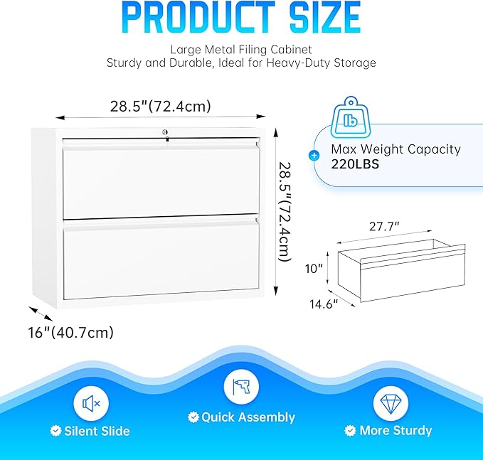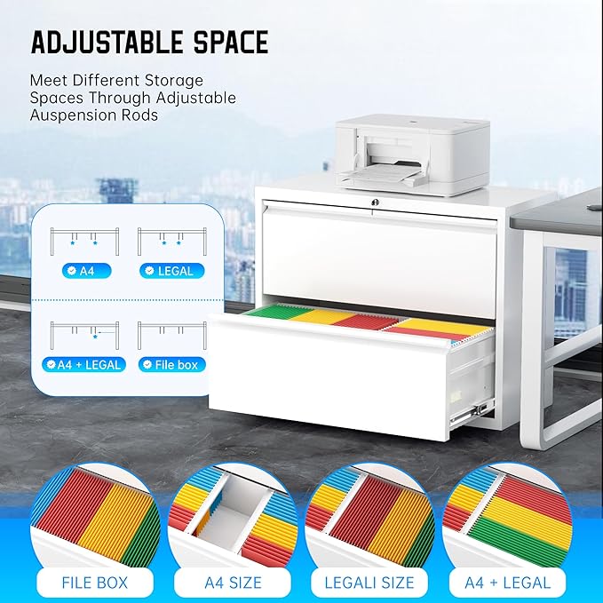 - ▶[STRONG STORAGE]: The maximum load of wide space 2 drawer lateral file cabinet around 220 LBS. Besides, the large surface will place files,and also, the deep drawers with side-to-side hanging rails will accommodate legal, A4 and F4 size letter folders in order.