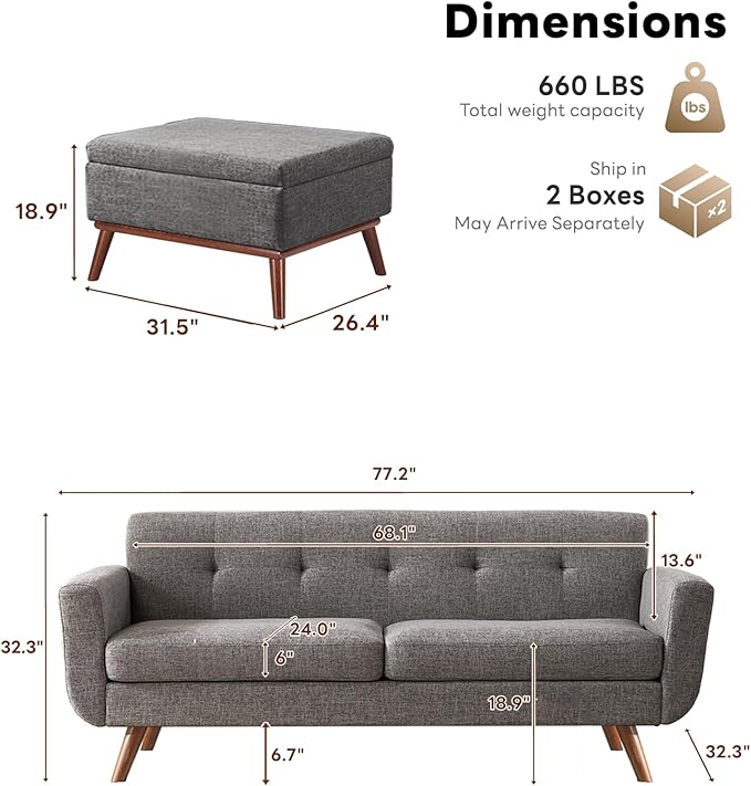 Tbfit Mid Century Modern Sofa Couch, Gray, Standard Sofa & Ottoman