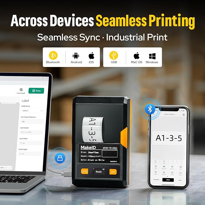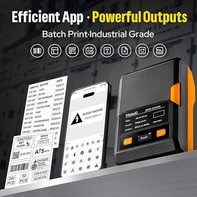 - Powerful Mobile App Features– The MakeID App includes 48 templates, 200+ icons, 20+ fonts, supports barcodes & QR codes, and allows bulk data import for fast and efficient on-site labeling.