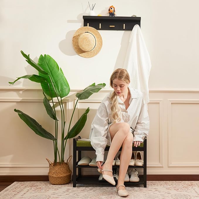 - 【4-IN-1 HALL TREE WITH BENCH】Transform your entryway or hallway with our versatile hall tree bench, seamlessly integrating a wall-mounted coat rack and shoe bench. Featuring a coat rack shelf for decorations, 5 T-shaped hooks for bags and clothes, a cushioned bench for comfortable seating, and 2 bottom shelves for convenient shoe storage.