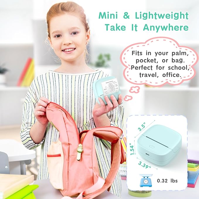 - Ultra-Compact & Lightweight - Measuring only 3.39" x 3.5" x 1.54" and weighing just 0.32 lbs, this mini thermal printer is truly pocket-sized. Its portable design makes it convenient to carry in a bag or even a pocket, so you can print receipts, notes, and labels anytime, anywhere—whether at school, the office, home, or while traveling.