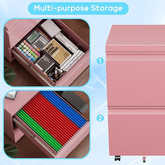Aobabo 2 Drawer File Cabinet, Lockable Metal Filing Cabinet with Wheels for Home Office, Legal/Letter Size, Fully Assembled Except Wheels, Pink