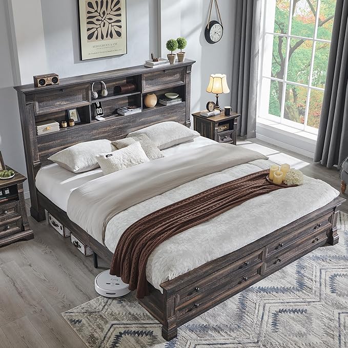 - Smart Storage King Bed Frame: Engineered as a functional bed frame with drawers, it combines 2 headboard drawers, 4 built-in shelves, and 2 large footboard drawers for concealed storage. Designed specifically for king bed frame and headboard configurations, the integrated dual-USB charging hub maximizes surface efficiency while maintaining rustic minimalism.