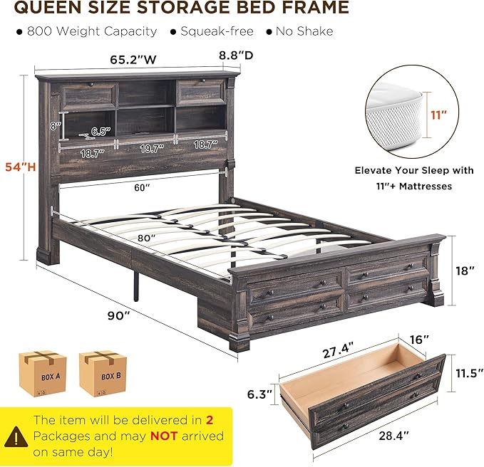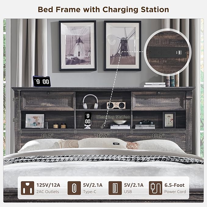 - Queen Bed Frames with Integrated Storage: Designed as a storage bed, it combines 2 headboard drawers, 4 built-in shelves, and 2 footboard drawers for concealed organization. The queen bed frames configuration optimizes space efficiency with hidden dual-USB hubs while preserving minimalist rustic charm.