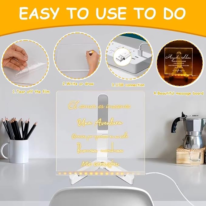 - 【Usage method】: Please remove the double-sided protective film from the acrylic sheet before use. Write or draw what you need on the acrylic board, adjust the Angle of the tripod, and place the noteboard on the tripod. Then, insert it and you will see glowing text or lines. This toolkit includes 7 quick-drying marks.For continuous use, simply wipe it with a damp cloth or tissue. Easy to clean and reusable office lobby. At home, it serves as a great tool for leaving family messages, organizing schedules, or even for kids to create their own colorful artworks