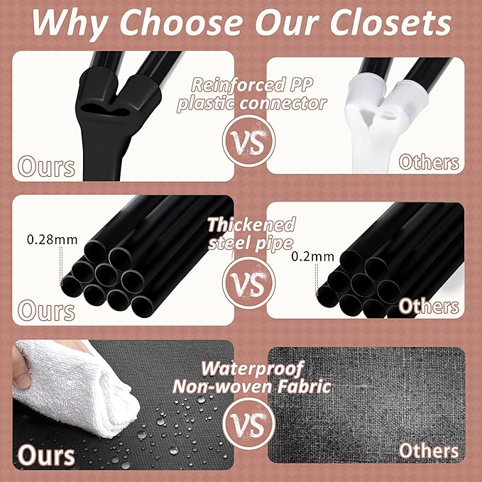 - 【Easy Assembly】 Portable closet wardrobe features uniformly sized steel pipes for quick setup. The steel pipe and plastic joints are swivel-connected, requiring less effort to assemble with clear instructions. In addition, we include extra parts for added peace of mind.