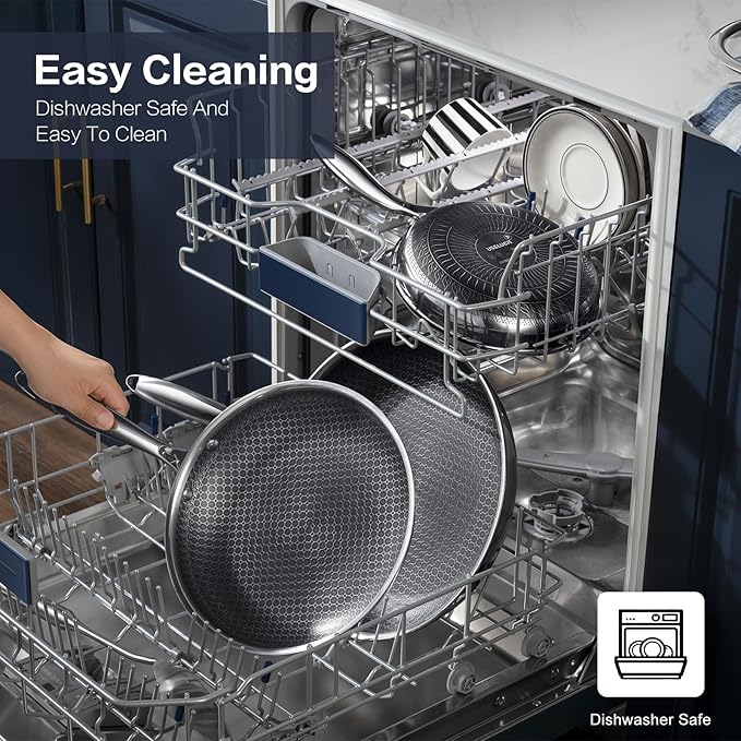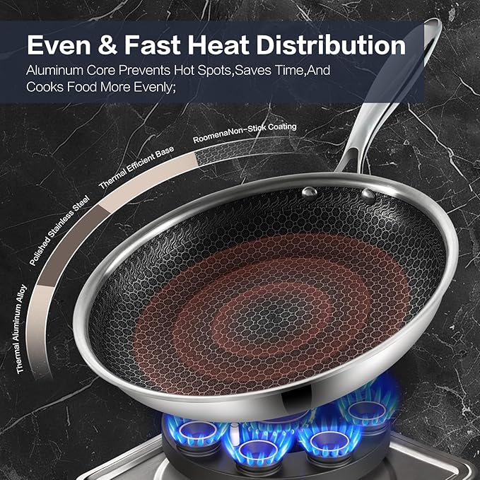 - 【Revolutionize Your Cooking】: Elevate your culinary experience with the mixed-material non-stick set. Featuring a unique three-layer structure. It combines a stainless steel outer layer with an aluminum core for even heat distribution and lasting durability. The laser-etched surface blends stainless steel’s frying power with the non-stick material’s effortless food release. It makes every cooking moment a delight.