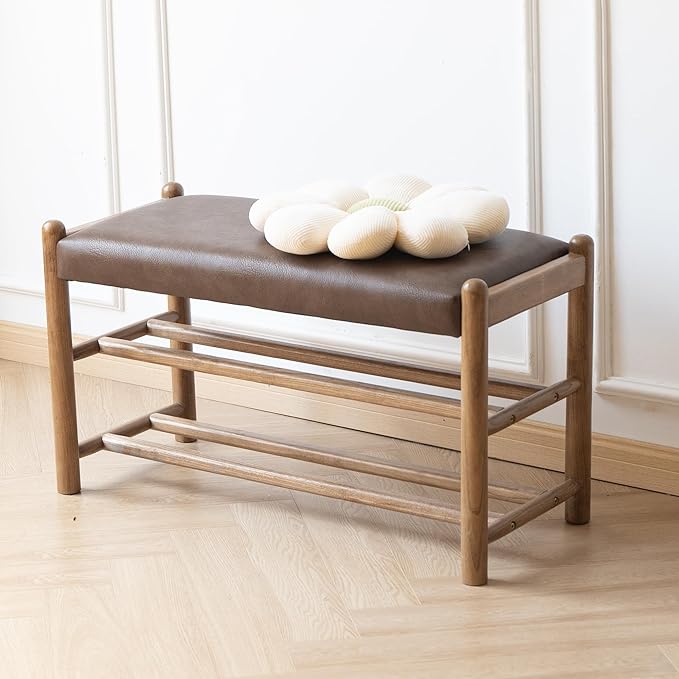 Solid Wood Entryway Bench with Shoe Storage, Rustic Oak Wood and PU Leather 31.5 Inch Long Seating for Living and Dining Rooms, 3-Tier Brown