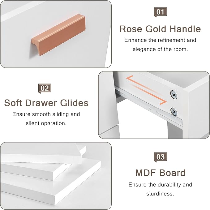 - Material and Stability: This Makeup Vanity table is constructed from high-quality MDF, ensuring durability. Thick board adds to the bottom of the drawers to reinforce them, increase load-bearing capacity, and enhance overall stability. The robust wood boards to withstand damage during transportation and use.
