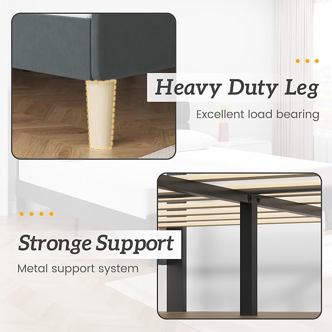 - 【Full Bed Frame with Noise Free & No Box Spring Needed】 The slatted portion of this full bed frame has a Velcro design that you can easily attach or detach. The entire middle of the full size bed frame is constructed with a metal support system, which greatly enhances its stability. At the same time, the metal support beam in the middle of this full size bed frame with headboard is equipped with EVA sponge, which reduces the squeaks that may occur during use and makes it as noise-free as possible. The overall structure of this full bed frame with headboard already provides enough support to be used straight away and there is no box spring needed