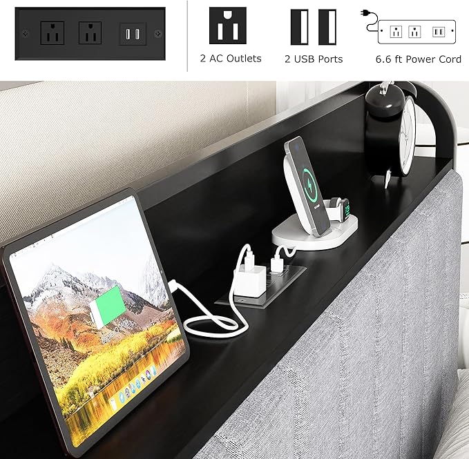 - 【Upholstered Headboard with Charging Station】-This twin size bed frame features a built-in charging station, including 2 standard power outlets and 2 USB ports for all your charging needs. Easy to charge your phone, tablet, lamp, humidifier, and other electronic devices.