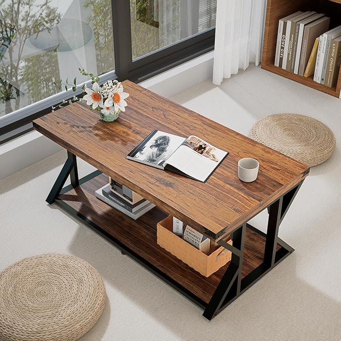 - 【Industrial Farmhouse Style】Designed with a rustic wood grain surface, angle iron accents, and a sturdy metal frame, this coffee table blends industrial charm with farmhouse warmth